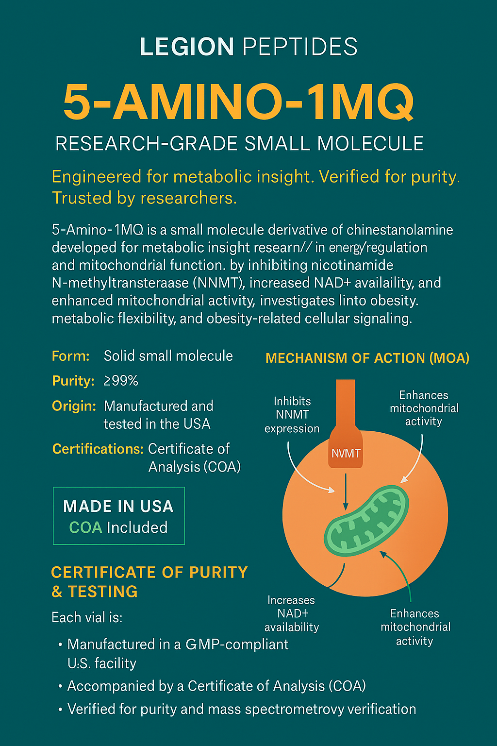 5-Amino-1MQ is a small molecule compound that inhibits nicotinamide N-methyltransferase (NNMT), an enzyme linked to NAD+ depletion and metabolic dysfunction. By blocking NNMT, 5-Amino-1MQ helps preserve cellular NAD+ levels, which are essential for energy metabolism, mitochondrial function, and fat oxidation. This molecule has shown promising research utility in models of obesity, metabolic syndrome, and age-related cellular decline.
