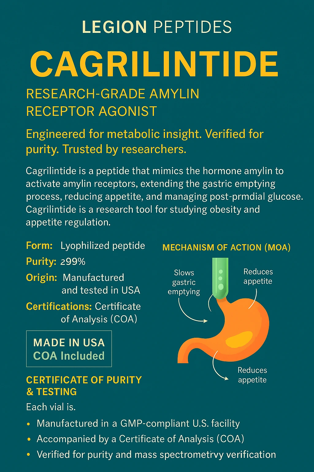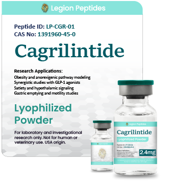 No. Cagrilintide sold by Legion Peptides is strictly for in vitro and in vivo laboratory research. It is not intended for human or veterinary use, and any off-label application is strictly prohibited.