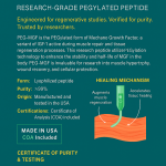 PEG-MGF promotes muscle regeneration by triggering satellite cell activation and proliferation. It mimics the natural MGF splice variant of IGF-1, which is expressed in response to mechanical overload. The PEGylation protects the peptide from rapid degradation, extending its half-life and making it more viable for research applications involving sustained activity.