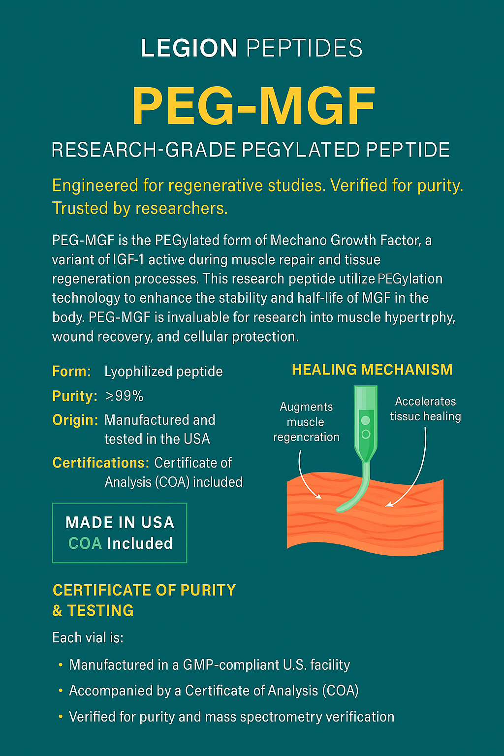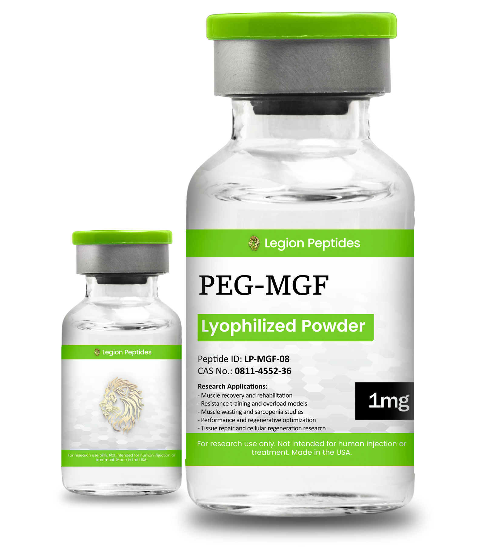 PEG-MGF promotes muscle regeneration by triggering satellite cell activation and proliferation. It mimics the natural MGF splice variant of IGF-1, which is expressed in response to mechanical overload. The PEGylation protects the peptide from rapid degradation, extending its half-life and making it more viable for research applications involving sustained activity.