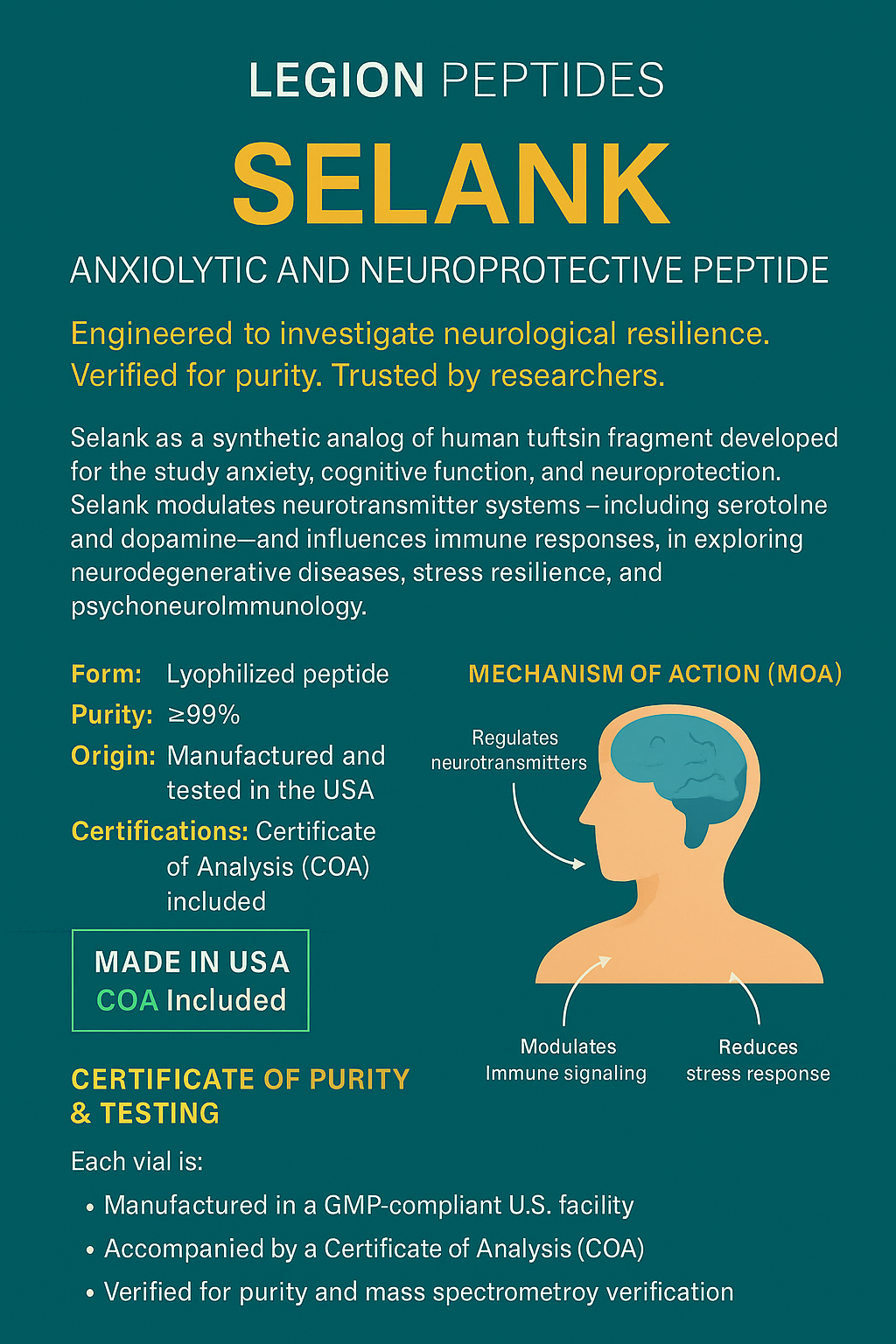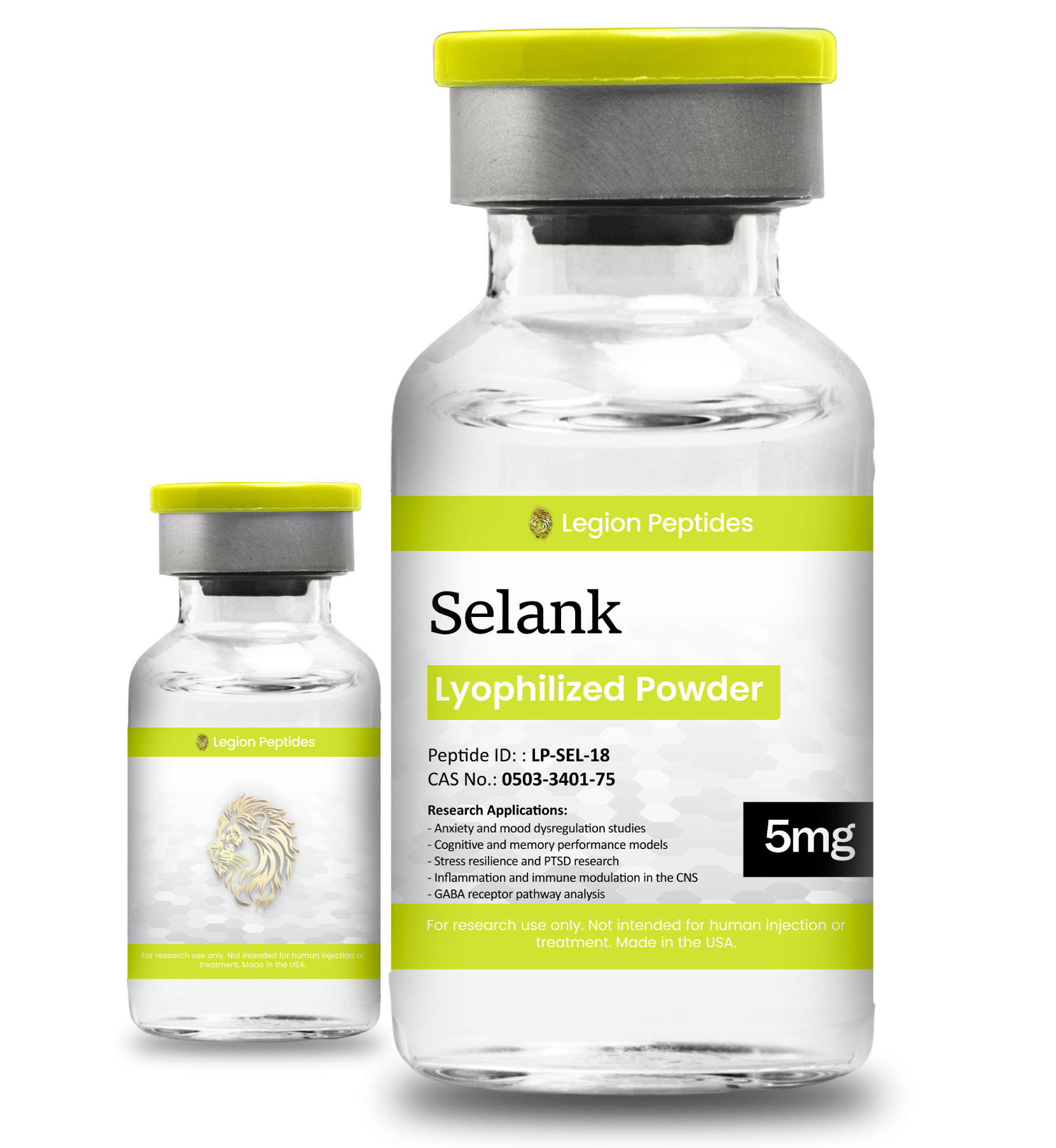 Selank is a synthetic heptapeptide developed as an analog of the naturally occurring tetrapeptide tuftsin. It has demonstrated strong anxiolytic (anti-anxiety), neuroprotective, and cognitive-enhancing properties in preclinical research. Selank is of particular interest in neuroscience and behavioral studies for its potential to modulate GABAergic activity, improve memory, and support immune function.