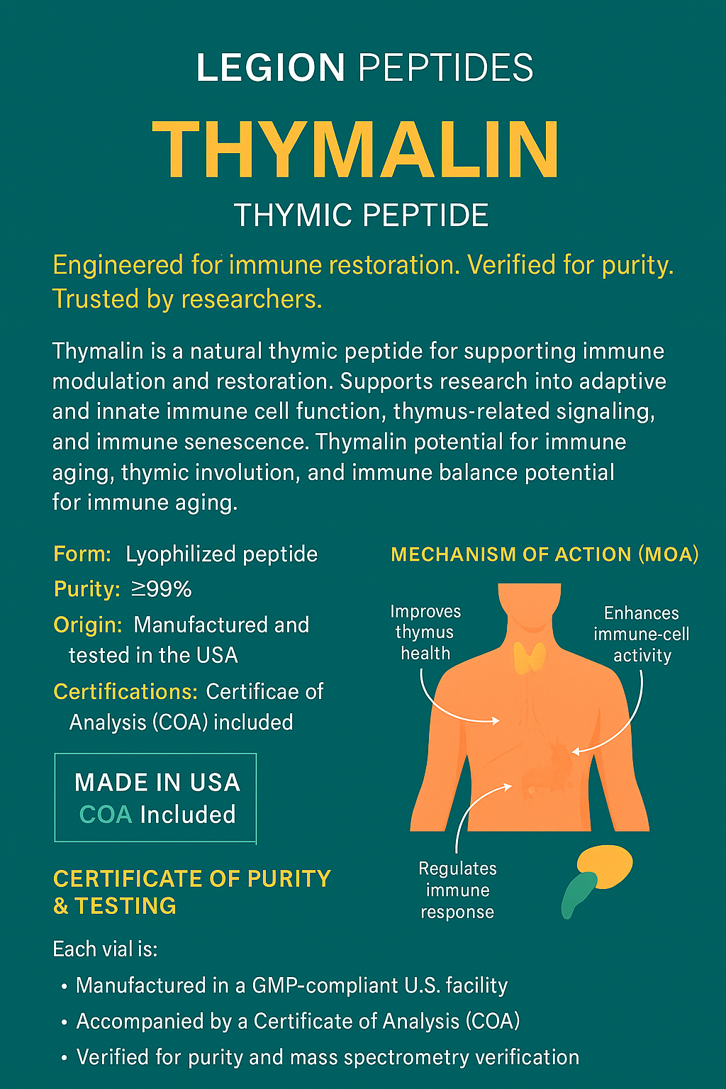 Thymalin is derived from the thymus and directly modulates T-cell maturation and immune system restoration, making it a valuable peptide for regenerative research.