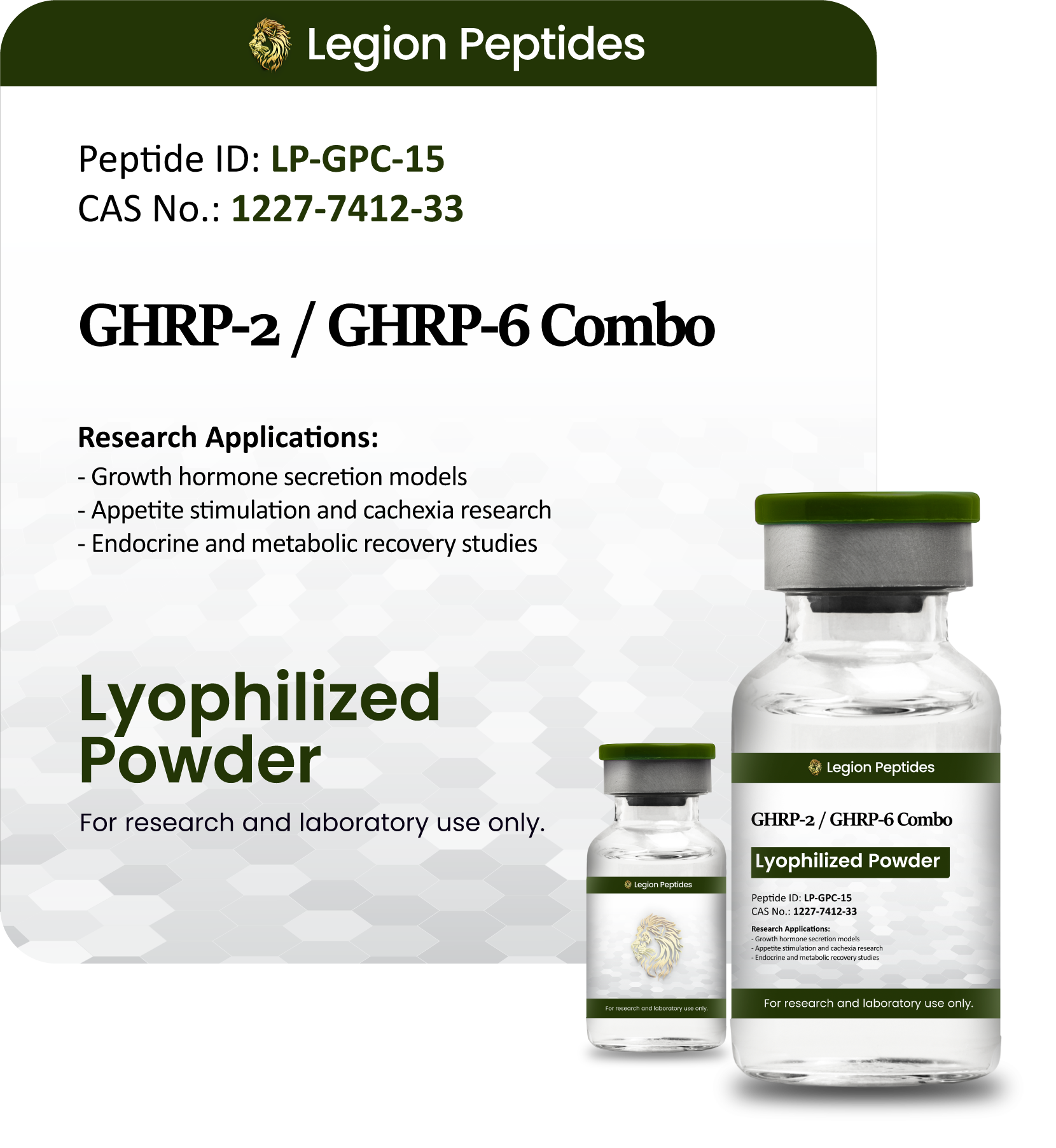The GHRP-2 / GHRP-6 Combo combines two potent growth hormone releasing peptides for synergistic stimulation of GH release and appetite regulation. These peptides act on the ghrelin receptor (GHS-R1a) to enhance pulsatile GH secretion and modulate feeding behavior. This combo is widely used in research on growth hormone dynamics, aging, metabolism, and appetite stimulation.