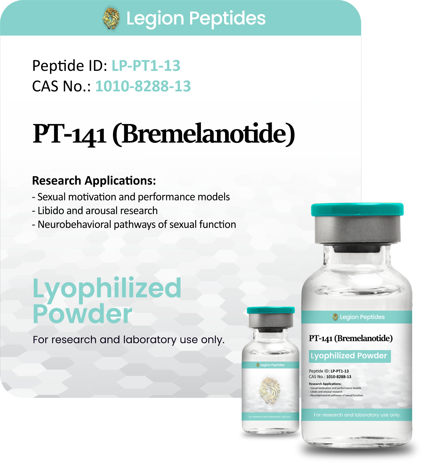 PT-141 (Bremelanotide) is a synthetic peptide analog of α-MSH studied for its role in enhancing libido and sexual function. Unlike other agents that act on the vascular system, PT-141 works directly on the central nervous system to stimulate sexual desire. It has been a subject of interest in preclinical and animal studies related to sexual dysfunction, performance, and behavioral stimulation.